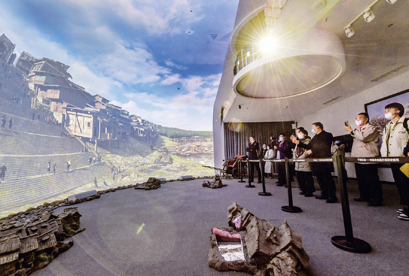 近年来,重庆红岩革命纪念馆以新技术把革命文物搬上屏幕和舞台,创新革命文物展示,让红岩革命文物“活”起来。图为在重庆红岩革命纪念馆“红岩记忆”数字体验厅内,观众们观看以双曲三维穹幕技术展示的场景。 新华社记者 李贺/摄