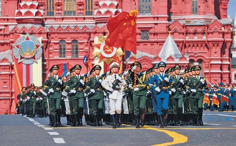 80年前,包括中国、苏联在内的全世界正义力量,同仇敌忾、英勇战斗,并肩打败了不可一世的法西斯势力,取得了正义战胜邪恶、光明战胜黑暗、进步战胜反动的伟大胜利。图为2025年5月9日,在俄罗斯首都莫斯科,中国人民解放军三军仪仗队方队参加纪念苏联伟大卫国战争胜利80周年庆典阅兵式。 新华社记者 白雪骐/摄