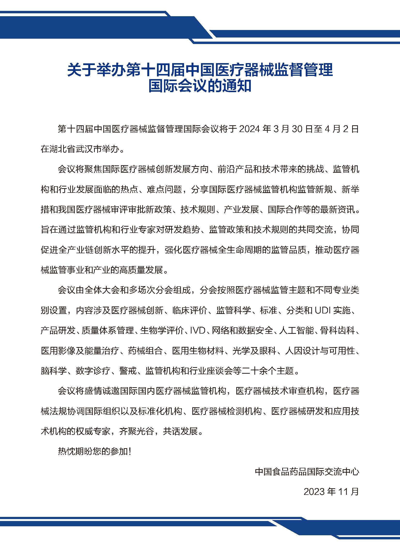 第十四届中国医疗器械监督管理国际会议第一轮通知(更新版)