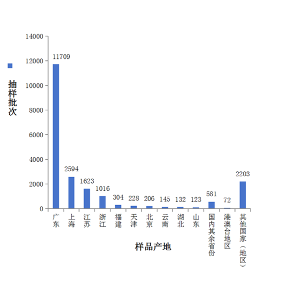 各省(区、市)化妆品抽样批次数量分布情况见图1。抽样主要采用现场抽样和网络抽样两种方式进行,抽样的地域分布情况见图2。样品的产地分布情况见图3。