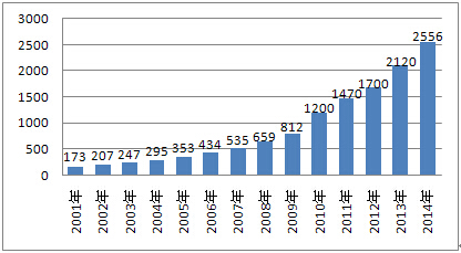 图1:2001~2014年我国医疗器械市场销售规模统计(单位:亿元)